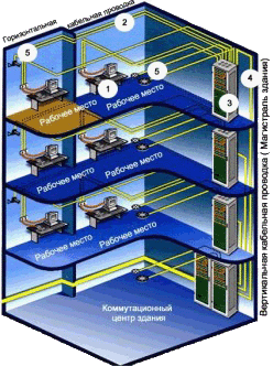 Структурированная кабельная система строится таким образом, чтобы каждый интерфейс (точка подключения к системе) обеспечивал доступ ко всем ресурсам сети. При этом на рабочем месте достаточно двух линий. К одной линии подключают, как правило, компьютер, ко второй – телефон. В большинстве случаев линии взаимозаменяемы. Кабели прокладывают от рабочих мест до распределительных пунктов. Распределительные пункты объединяют магистральными линиями по топологии «иерархическая звезда».